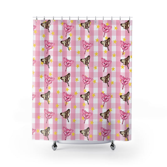 Cake Pup Shower Curtain Chocolate and Raspberry Dessert Dogs | Pink Gingham Design | Starry